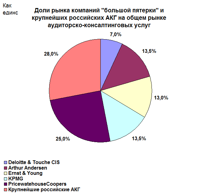В результате многие крупные аудиторские компании решают, что участвовать в борьбе за аудит госпредприятий не имеет смысла, и занимают выжидательную позицию. А те компании, которые берутся обслуживать ГУПы, вынуждены работать на уровне себестоимости, жалуясь не демпинг мелких аудиторских фирм. Утешением им служит шанс занять место на рынке и надежда на улучшение платежеспособности госпредприятий в будущем. Благо ГУПов много – из 14 тыс. госпредприятий минимум тысяча, по оценкам, будет отвечать критериям обязательного аудита. Кроме того, в текущем 2001 году аудиторы должны будут провести аудит сразу за два предыдущих года. С учетом этого емкость рынка аудиторских услуг вырастет примерно на 10 млн. долларов (10% всего российского аудита).