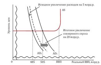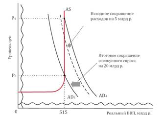Но кривая совокупного спроса смещается вправо, до AD1 , т. е. спрос увеличивается больше чем на 5 млрд. р. дополнительных государственных расходов. Это происходит потому, что эффект мультипликатора приумножает первоначальное изменение спроса с каждым следующим циклом новых потребительских расходов. Если ПСП в экономике составляет 0,75, то простой мультипликатор равен 4. Кривая совокупного спроса сдвигается вправо на расстояние, в 4 раза превышающее длину отрезка, который представляет увеличение государственных расходов на 5 млрд. р. Данное увеличение совокупного спроса происходит в пределах горизонтального отрезка кривой совокупного предложения, поэтому мультипликатор действует в полную силу и реальный объем производства возрастает в 4 раза. Заметим, что реальный объем производства подскочил до 505 млрд. р., т. е. возрос на 20 млрд. р. по сравнению с уровнем 485 млрд. р., наблюдавшимся во время спада. Одновременно сокращается безработица, так как фирмы вновь нанимают работников, уволенных в период спада [7, c. 28].