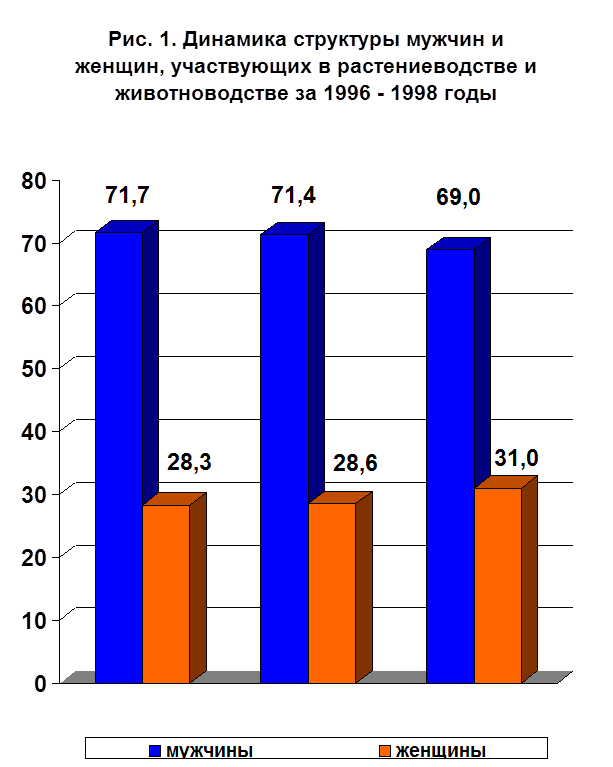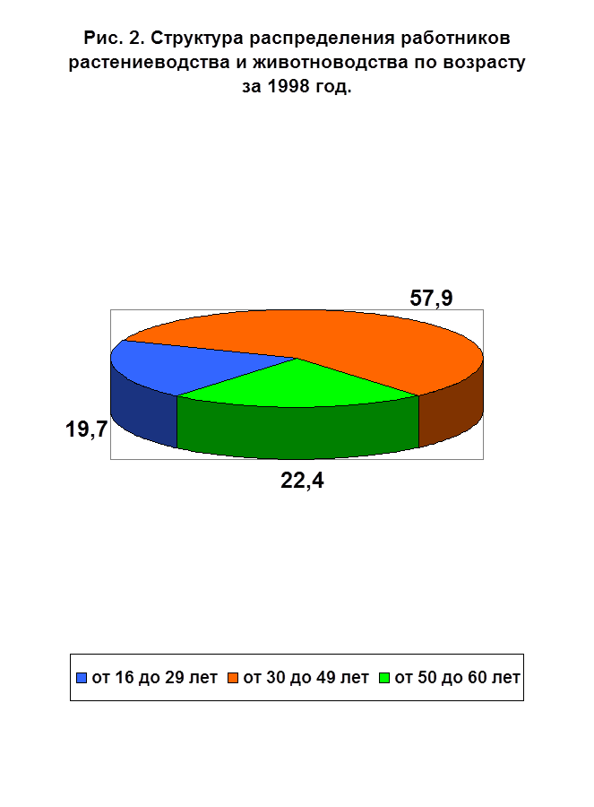 На формирование рынка труда в сельской местности на сегодняшний день большое влияние оказывает демографическая ситуация, для которой характерны: устойчивая тенденция к снижению доли населения трудоспособного возраста, стабилизация в последние годы доли детей и рост доли лиц старше трудоспособного возраста. Соответственно, средний возраст сельского населения растет активнее и остается выше городского. Средний возраст мужчин – 33 года, а женщин – 39. [10]