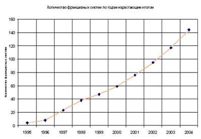 На графике представлен рост российских франшизных компаний нарастающим итогом за период с 1995 года по 2004 год.