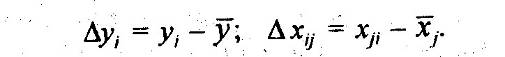 Чтобы упростить систему уравнений МНК, необходимую для вычисления параметров уравнения (8.32), обычно вводят величины отклонений индивидуальных значений всех признаков от средних величин этих признаков.