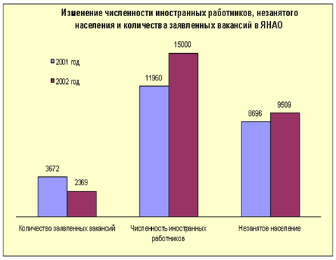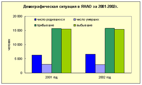 В течение 2002 года в автономный округ прибыло 15783 человек, выбыло 15398 человек, механический прирост составил 475 человек. Миграционный отток отмечен в муниципальных образованиях: г. Надым и Надымский район (320 чел.), г. Лабытнанги (275 чел.), г. Новый Уренгой (206 чел.), Тазовский район (83 чел.).
