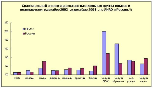 В декабре 2002 год индекс потребительских цен по Ямало-Ненецкому автономному округу на все товары и платные услуги составил 114,8 % к декабрю 2001 года, по РФ - 115,1% (индекс потребительских цен по ЯНАО в декабре 2001 года к декабрю 2000 года - 122,9%, по РФ - 118,6%). Индексы цен на продовольственные товары (включая алкогольную продукцию) - 112,7 %, на непродовольственные товары - 103,6 %, платные услуги - 141,4 процента.