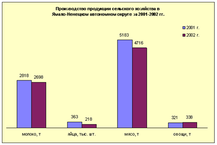 Уменьшение объемов производства мяса скота и птицы связано с увеличением маточного поголовья в оленеводстве для дальнейшего воспроизводства стада, а также неблагоприятными природно-климатическими условиями 2002 год при заготовке грубых кормов.
