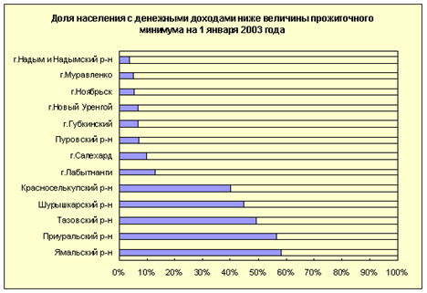 Численность наличного населения автономного округа на 1 января 2003 года по оперативным данным составила 504,2 тыс. человек, в том числе городское - 416,4 тыс. человек (82,6%), сельское - 87,8 тыс. человек (17,4%). За 2002 год численность жителей округа увеличилась на 4044 человек. Наибольший прирост населения отмечен в муниципальных образованиях: г. Ноябрьск (1259 чел.), г. Салехард (699 чел.), Пуровский район (684 чел.)