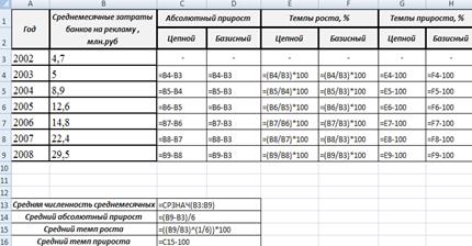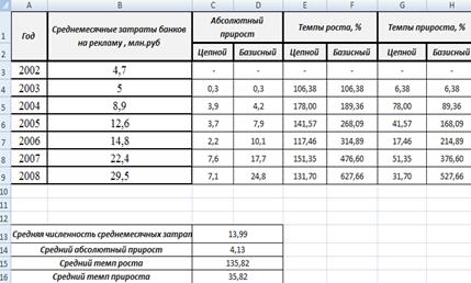 По данным отчетов о спаде или же росте среднемесячных затрат банков на рекламу за несколько лет, представленным в табл.1, проведем анализ динамики, для чего рассчитаем следующие показатели: