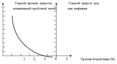Принципиально новые подходы к данной проблеме были представлены в знаменитой работе английского экономиста О. Филлипса (1914 – 1975), которая вышла в 1958 г. Обобщив статистические данные по Великобритании за 1861 – 1957 гг., автор построил кривую , характеризующую взаимосвязь между среднегодовым ростом заработной платы и безработицей. Эта взаимосвязь оказалась обратной: если заработки росли быстро, безработица была небольшой, и наоборот. Кривая О. Филипса (рис.1) оказалась вогнутой относительно оси ординат: одному и тому же приращению заработной платы соответствовало сравнительно небольшое сокращение безработицы при низком ее уровне и значительное – при высоком: