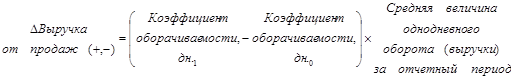Предлагаемый далее для анализа показателя характеризует дополнительное привлечение (высвобождение) средств в оборот, вызванное замедлением (ускорением) оборачиваемости оборотного капитала. При замедлении в оборот вовлекаются дополнительные средства. Эффект ускорения оборачиваемости выражается в сокращении потребности в оборотных средствах в связи у улучшением их использования, экономии, что влияет на прирост объемов производства, и как следствие - на финансовый результаты.