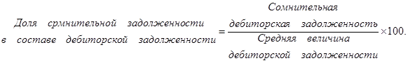 В этих целях организации следует жестко и повседневно контролировать факты наращения сомнительной задолженности в общем объеме дебиторской задолженности и принимать адекватные меры по ее сокращению. Этот показатель рассчитывается так: