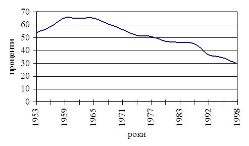 Специалисты подчеркивают важное значение прямой государственной поддержки для обеспечения высокой конкурентоспособности товаров на мировых рынках. Примером такой стратегии есть государственная политика финансирования федеральных программ НИОКР в США. Так, удельный вес федеральных капиталовложений в НИОКР в общих национальных затратах на исследование и разработку составляла в начале 60-х лет 70%. Тем не менее эта величина со временем значительно уменьшилась и в конце 90-х лет ХХст. Составляла близко 30% (рис.2).