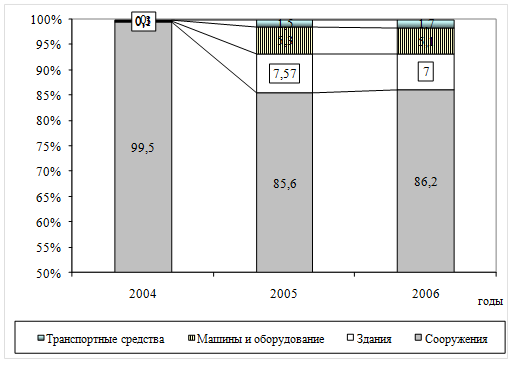 - совершенствование структуры основных производственных фондов – доля активной части основных фондов предприятия возросла за 2004-2006 гг. с 0,2% до 6,77%;