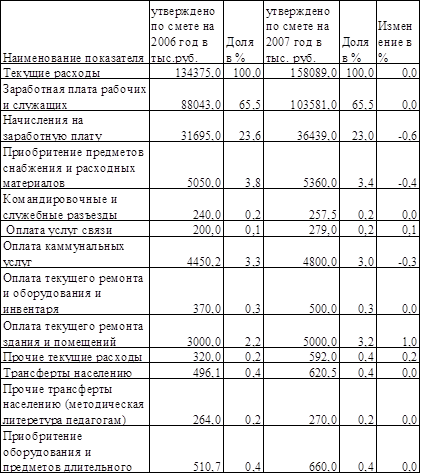 Наибольший удельный вес в расходах организации занимает расходы на заработную плату и начисления на заработную плату 65,5 и 23,6 процентов в 2006 году 65,5 и 23,0 процентов соответственно в 2007 году. Оплата коммунальных услуг и приобретение предметов снабжения, расходных материалов, а также оплата текущего ремонта зданий относятся также к основным расходам учреждения, что обусловлено спецификой бюджетной системы. По оплате за коммунальных услуг и приобретению предметов снабжения наблюдается сокращение расходов на 0,3 и 0,4 процентных пункта соответственно, что связанно с программой энергосбережения и более жесткому контролю со стороны органов казначейства за приобретением. Целенаправленным использованием бюджетных средств выделяемых на покупку предметов снабжения и расходных материалов. По оплате текущего ремонта зданий в 2007 году наблюдается увеличение расходов на 1,0 процентных пункта по сравнении с аналогичным периодом прошлого года.
