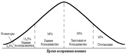 Другие люди воспринимают новинки гораздо позже. Все это позволило квалифицировать людей по степени их восприимчивости (Рис.2.). После замедленного начала новинку начинает воспринимать все больше людей. Со временем их число достигает пикового значения, а затем процент начинает уменьшаться по мере уменьшения числа еще не воспринявших товар. Новатоварами считаются первые 2.5% покупателей, к ранним последователям относят следующие 13.5% и т.д.