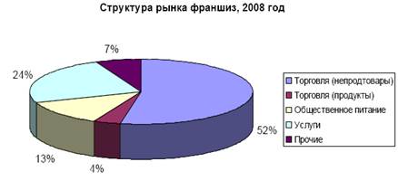 Как видно из представленных в диаграмме данных сектор торговли продуктами питания не занимает ведущего места в структуре франчайзингового рынка. Это связано в основном со спецификой самого продукта, необходимостью установления жестких стандартов логистики и обмена данных, определенными трудностями исполнения стандартов на местах и осуществлением контрольной функции особенно в крупноформатном и широко ассортиментом секторе. Наиболее приемлемым для торгового франчайзинга является сектор специализированной торговли с ограниченным ассортиментом товаров (например, чай, сыры, замороженные продукты и др.). Этот вывод подтверждается не только зарубежной практикой, но и перераспределением в 2008 году франшиз внутри продуктового сектора в России в пользу специализированной торговли.