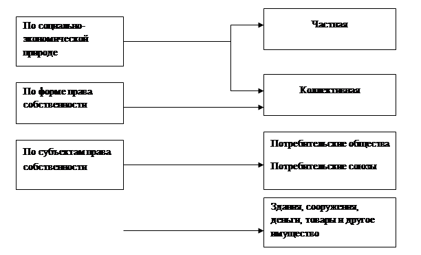 Выделяется государственная, муниципальная и частная собственность физических и юридических лиц (единоличная или коллективная).