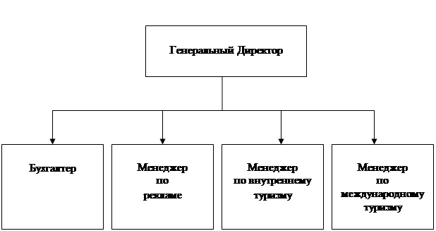 Штат фирмы состоит из 5 человек: директор, бухгалтер, менеджер по рекламе, менеджеры по направлениям. Менеджеры проходили дополнительные курсы по туризму и сервису, необходимые стажировки, обладают навыками корпоративного общения, владеют достоверной информацией о разрабатываемых маршрутах, имеют представление о правовых основах туристской деятельности. Организационно-управленческая структура предприятия в соответствии с направлениями работы является линейно-функциональной и выглядит следующим образом: