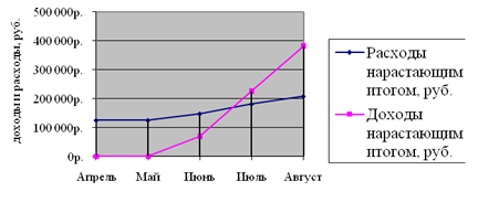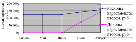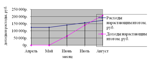 Доходы начинают покрывать расходы в начале августа, турфирма выходит на точку безубыточности, на конец августа валовый доход турфирмы «Виктория» составит 34 597,75 рублей.