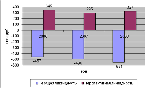 По данным бухгалтерской отчетности за период с 2005 по 2007 год был проведен анализ абсолютных и относительных показателей ликвидности ООО «ИнформГеоСервис». Абсолютные показатели текущей ликвидности имеют отрицательные значения. Это говорит о том, что абсолютно ликвидные и быстрореализуемые активы не превышают краткосрочные обязательства организации. Значения перспективной ликвидности свидетельствуют о том, что медленно реализуемые активы больше долгосрочных обязательств.
