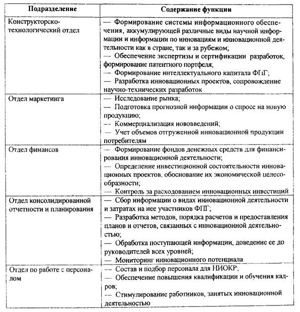 Подобное распределение и систематизация функциональных обязанностей позволит сформировать действенную систему управления инновационной деятельностью в ФПГ.