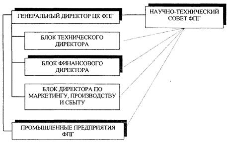 Координирующим центром при этом выступит Научно-технический совет (рис. 3.2.), который будет функционировать при Генеральном директоре ЦК ФПГ и представлять собой коллективный орган по выработке стратегических целей развития ФПГ. В совет войдут руководители функциональных блоков, руководители перечисленных служб и отделов, а также руководители промышленных предприятий группы.