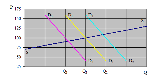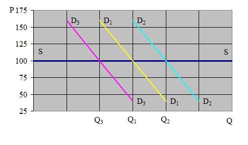 Графически это показано на рисунке 11. Первоначальный рыночный спрос, отраслевое производство и цена — D1 D1 , Q1 и 100 дол. соответственно. Увеличение спроса до D2 D2 нарушит это равновесие и повысит экономические прибыли. По мере того как новые фирмы вступают в отрасль, отраслевое предложение будет увеличиваться, вызывая тенденцию к понижению цены продукта, а цены ресурсов будут расти, вызывая рост средних валовых издержек производства. Вследствие этих увеличений средних валовых издержек новая цена равновесия в долговременном периоде установится на некотором уровне выше первоначальной цены (например, 110 дол.). Наоборот, снижение спроса с D1 D1 до D3 D3 сделает производство неприбыльным и вызовет массовый отток фирм из отрасли. Сокращение спроса на ресурсы относительно их предложения понизит цены на них и вызовет понижение средних валовых издержек производства. Следовательно, новая цена равновесия будет установлена на некотором уровне ниже первоначальной цены (например, 90 дол.). Соединив эти три точки равновесия, мы получим восходящую кривую предложения в долговременном периоде, как изображено SS на рисунке 11. [4,198]