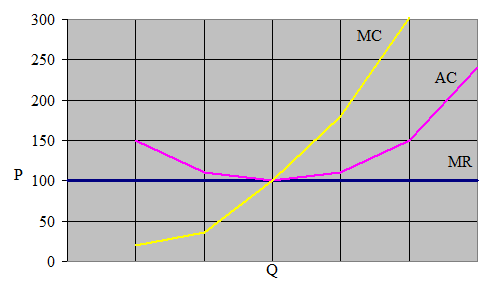 Рис. 12. Положение равновесия конкурентной фирмы в долговременном периоде: P=AC=MC.
