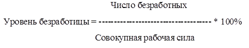 В Российской Федерации применяется "Методика расчета общей численности безработных, уровня общей и зарегистрированной безработицы", которая разработана и утверждена Госкомстатом России 4 октября 1995г. На ее основе применяются два способа расчета уровня безработицы по состоянию на определенную дату: А) Коэффициент (уровень) безработицы используется для измерения масштабов безработицы и рассчитывается как отношение числа безработных к совокупной рабочей силе: