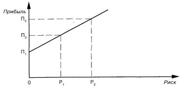 Из графика видно, что нулевой риск обеспечивает самый низкий доход (0; П1 ), а при самом высоком риске Р = Р2 . прибыль имеет наиболее высокое значение П = П3 (П3 > П2 > П1 ).