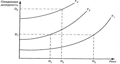 Кривые на карте предпочтений имеют положительный наклон, так как из сопоставляемых критериев один — позитивный, а другой — негативный. Изображенные на рисунке кривые носят название «кривых равных предпочтений» или «кривых безразличия», так как каждая из них отражает своими точками равнопредпочтимые для предпринимателя при данном уровне его удовлетворенности пары ожидаемой эффективности и рискованности решения. Приемлемых уровней удовлетворенности (полезности) может быть несколько. На приведенном рисунке их три, из них наиболее низкий из всех приемлемых уровень F1 наиболее высокий — F3 .Уровень F1 ниже, чем уровень F2 так как при одной и той же ожидаемой доходности решения в первом случае (для F1 ) величина риска R3 больше, чем риск R1 во втором случае (для F3 ). Сочетание же ожидаемой рентабельности решения и его рискованности, отвечающее одной из точек кривой равных предпочтений для уровня F3 , оказывается тогда за счет более высокой ожидаемой доходности вложений в данное решение (хотя и при большем риске) боле привлекательным для предпринимателя, соответствует более высокому уровню полезности для него. Карта предпочтений предпринимателя должна быть построена для него либо им самим, либо с помощью сторонних экспертов построена эмпирически, то есть на основе обработки данных анализа решений, которые принимались ранее.