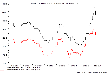 С начала 1го квартала 2002 года мировые цены на сталь демонстрировали устойчивую тенденцию к росту. С апреля 2002 года цены на мировом рынке стали заметно выросли, сигнализировав начало стадии циклического роста.