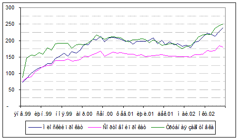 Внутренние цены на сталь в прошлом году в целом демонстрировали динамику, схожую с динамикой цен на мировых рынках. С небольшим временным лагом внутренний рынок отреагировал на взлет цен на международных рынках, и, начиная с середины лета, цены начали расти. Вместе с тем к концу года данный рост вернул цены лишь на уровень середины 2000 года, тогда как с конца 2000 года и всю первую половину 2002 года они стагнировали в рублевом выражении и снижались в долларовом эквиваленте. Активный рост цен по основным товарным позициям продолжился в первом квартале 2003 года.