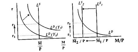 Так, изменение уровня дохода, например, его увеличение (см. рис. 1), повышает спрос на деньги (сдвиг вправо кривой спроса на деньги L°) и ставку процента (от r1 до r2). Сокращение предложения денег также ведет к росту процентной ставки (рис. 2).