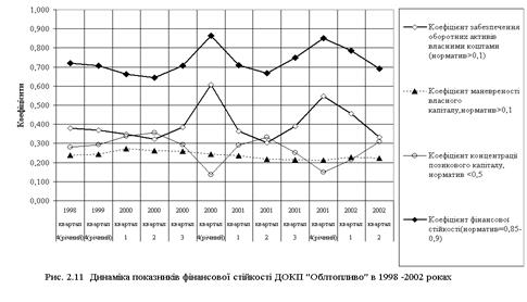 У той же час, як видно за результатами розрахунків відносних показників фінансової стійкості, положення ДОКП «ОБЛПАЛИВО» – досить стійке, оскільки основними ресурсами капіталу підприємства є власні засоби, що складають біля 70,0 % валюти пасивів балансу. При цьому слід зауважити, що практично 70% капіталу ДОКП “ОБЛПАЛИВО” вкладений в основні засоби (імобілізовані) і тільки 30% капіталу вкладені в оборотні фонди підприємства.