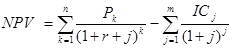 Якщо проект припускає не разову інвестицію, а послідовне інвестування фінансових ресурсів протягом m років, то формула для розрахунку NPV модифікується в такий спосіб (з врахуванням впливу інфляції як на дисконтовані потоки інвестиції, так і на сгенеровані потоки прибутку інвестиційного проекту):