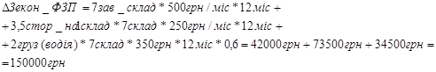 ліквідація 7 складів (згідно штатному розкладу табл. 2.1 з 52 робітників складів ліквідовуються посади зав.складів та сторожів, а 40 % робочих - водіїв переміщуються на об'єднані склади) дає щорічну економію фонда оплати праці (з врахуванням апарату АУБП – зав.складів) не менше:
