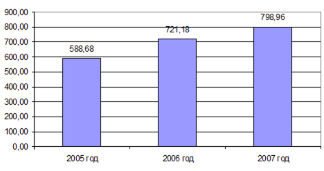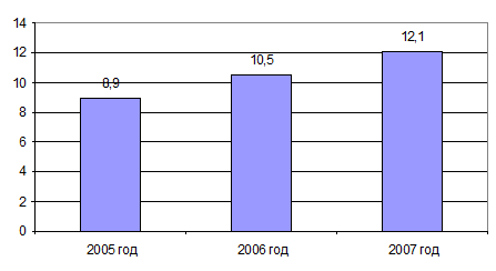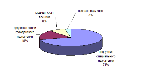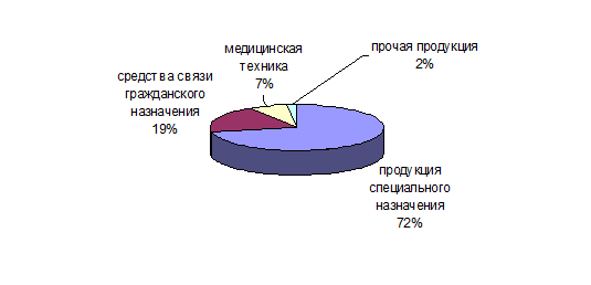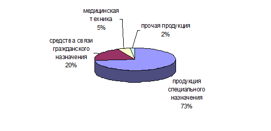 Как показывают данные рисунков, в 2005-2007 гг. в структуре товарной продукции первое место занимала продукция специального назначения (средства связи для армейских подразделений и МВД) – в 2005 году 71%, в 2006 году 72%, в 2007 году 73%. Второе место занимают средства связи для гражданских служб - в 2005 году 18%, в 2006 году 19%, в 2007 году 20% в общей структуре выпуска продукции.