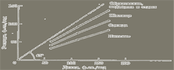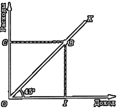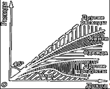 Перейдемо тепер до вельми важливої властивості кривих Енгеля: виявляється, криві витрат на всі споживані товари можуть бути представлені на одному графіку. Як це зробити? Проведемо на площині дохід-витрати лінію, на якій витрати дорівнюють доходу. Як відомо з курсу математики, ця лінія - бісектриса центрального кута (рис. 5). На рис. 6 ця лінія показана переривчастою лінією. Так як ми вважаємо, що споживач весь свій дохід витрачає на придбання товарів, дана лінія представляє собою лінію сумарних витрат споживача на всі об'єкти, куплені товари.