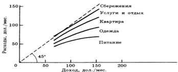 Тут, як і на попередньому графіку, витрати на харчування займають ще досить велику частину загальних витрат, але вже видно невеликі заощадження при зростанні доходу, а також "дефіцитне" споживання при дуже маленькому його рівні.