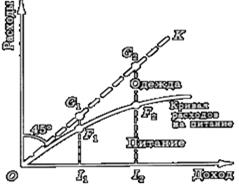 Нехай споживач купує два продукти - їжу та одяг. Зобразимо на рис. 6 криву витрат на харчування. Ордината будь-якої точки на цій кривій показує, як відомо, величину витрат на харчування при даному рівні доходу споживача. Так, /1 F1 - витрати на харчування при доході /1 . У той же час /1 G1 , - величина сумарних витрат споживача при доході /1 , (виходячи з розглянутих властивостей лінії ОK). Тоді що ж показує відрізок F1 G1 ? Очевидно, F1 G1 = /1 G1 - /1 F1 -величина витрат споживача на одяг. Аналогічні міркування можна провести для будь-якого рівня споживчого доходу. Таким чином, на рис. 6 ми можемо одночасно бачити, як змінюються при зміні доходу і витрати на харчування, і витрати на одяг.