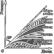 На підставі лінії дохід-споживання можна побудувати графік дохід-витрати для окремого блага. На горизонтальній осі будемо відкладати величину доходу, а на вертикальній – грошову суму витрат на дане благо (рис. 2). З зростанням доходу крива витрат на харчування втрачає нахил - попит насичується, а крива витрат на одяг стає все крутішою – майже всі прирощення доходу йдуть на одяг. Ця залежність була видна на лінії дохід-споживання (рис.1).
