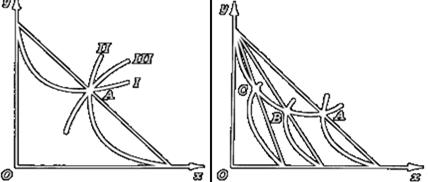 2.2. Якщо зміна доходу при постійних цінах виражалася в паралельних зрушеннях бюджетної лінії (рис. 1), то зміна ціни на один з товарів при сталості доходу і ціни іншого товару буде виглядати як поворот бюджетної лінії (мал. 10). Таким чином, кожному значенню ціни товару Х буде відповідати своя бюджетна лінія, а кожній бюджетній лінії - своя точка дотику з якою-небудь кривою байдужості. Поєднавши всі ці точки вибору, як у попередньому розділі, ми отримаємо лінію ціна-споживання товару X.