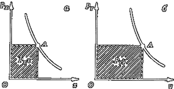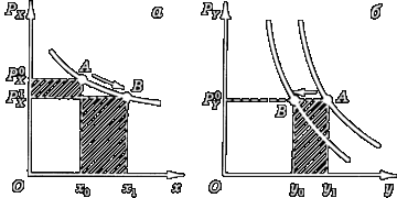 Отже, споживач знаходиться в точці А (рис. 15, а), купуючи в одиницю часу x0 товару Х за ціною і y0 товару Y за ціною (рис. 15, б). Коли ціна Х раптово падає з до, у споживача з'являється зайва сума грошей, якою він може розпорядитися. Цей виграш споживача не залежить від форми кривої попиту, він повністю визначається початковим об'ємом споживання x0 і величиною падіння ціни (-). Але крива попиту показує, як він розподілить вивільнену суму. Подивіться на рис. 15, а. Споживач збільшує витрати на товар X, переходячи по кривій попиту з точки А в точку В. Заштриховані площі на рис. 15, а показують зменшення витрат через зниження ціни та їх збільшення, що з покупкою додаткової кількості товару X.