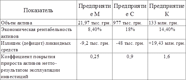 Візьмемо три підприємства, що знаходяться на різних стадіях розвитки: М («мале»), С («середнє») і ДО («значного»), див. таблицю 1.