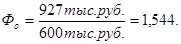 Например, если объём произведённой продукции 927 тыс. руб., а средняя за период стоимость основных производственных фондов 600 тыс. руб., то фондоотдача составит: