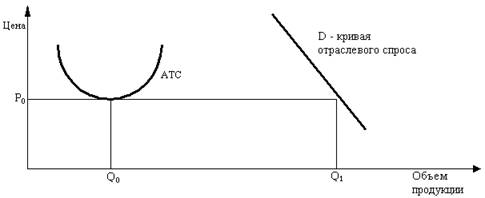 Таким образом, при цене, покрывающей лишь минимум возможных издержек, достаточно будет всего нескольких компаний, чтобы обеспечить весь имеющийся спрос. Как показано на рисунке 1, если средние издержки меняются в соответствии с кривой АТС, а минимум издержек достигается фирмой при объеме продаж Q0 , будет достаточно лишь 2 - 3 компаний, чтобы при цене Р0 удовлетворить весь рыночный спрос Q1 . В такой ситуации уровень рыночной концентрации будет очень высоким.