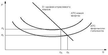 Фирмы-олигополисты, зная, что появление нового конкурента уменьшит их долю рынка, попробуют не допустить этого, воспользовавшись своими преимуществами. Они установят цену ниже Рн , но в силу экономии от масштабов производства и в этом случае (между Рн и Ро ) будут получать прибыль. Новая же фирма понесет значительные потери и вынуждена будет уйти с рынка (при ценах ниже Рн кривая спроса Dн лежит ниже АТС, и, следовательно, новая фирма не может покрыть своих издержек).