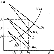 Поскольку рыночный спрос есть величина заданная, расширение производства фирмой Y вызовет сокращение спроса на продукцию фирмы X. На рисунке 4 показано, как сместится график спроса на продукцию фирмы X (он будет сдвигаться влево), если Y начнет расширять продажу. Цена и объем производства, устанавливаемые фирмой X исходя из равенства предельного дохода и предельных издержек, будут снижаться соответственно от