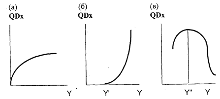 Кривая на рис. 4(в) описывает некачественные товары: до тех пор, пока доход не достигает величины Y" , потребление таких товаров растет, а затем, по мере повышения достатка потребителей, QD подобных товаров сокращается.