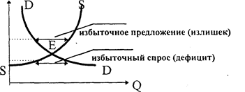 Точка пересечения кривых спроса (DD) и предложения (SS ) есть точка равновесия (Е ). В этой точке объем спроса равен объему предложения. Здесь фиксируется формирующаяся при этих условиях равновесная цена. Положение на рынке, при котором количество товаров или услуг, которые хотят приобрести потребители, абсолютно идентично количеству товаров и услуг, которые желают предложить производители, есть рыночное равновесие. Однако, равенство спроса и предложения—это скорее теоретическая абстракция, позволяющая нам выявить наиболее важные закономерности функционирования рыночного механизма, ибо в реальной хозяйственной практике такое совпадение бывает весьма редким. Отклонения от рыночного равновесия могут быть в следующих формах: