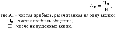 Одним из показателей, характеризующих финансовое состояние АО, определяющее процесс распределения прибыли, является доля прибыли, рассчитанная на одну акцию. Величина чистой прибыли, приходящейся на одну акцию, позволяет реально оценить эффективность деятельности АО, его финансовое положение. Рассчитывается такой показатель по формуле